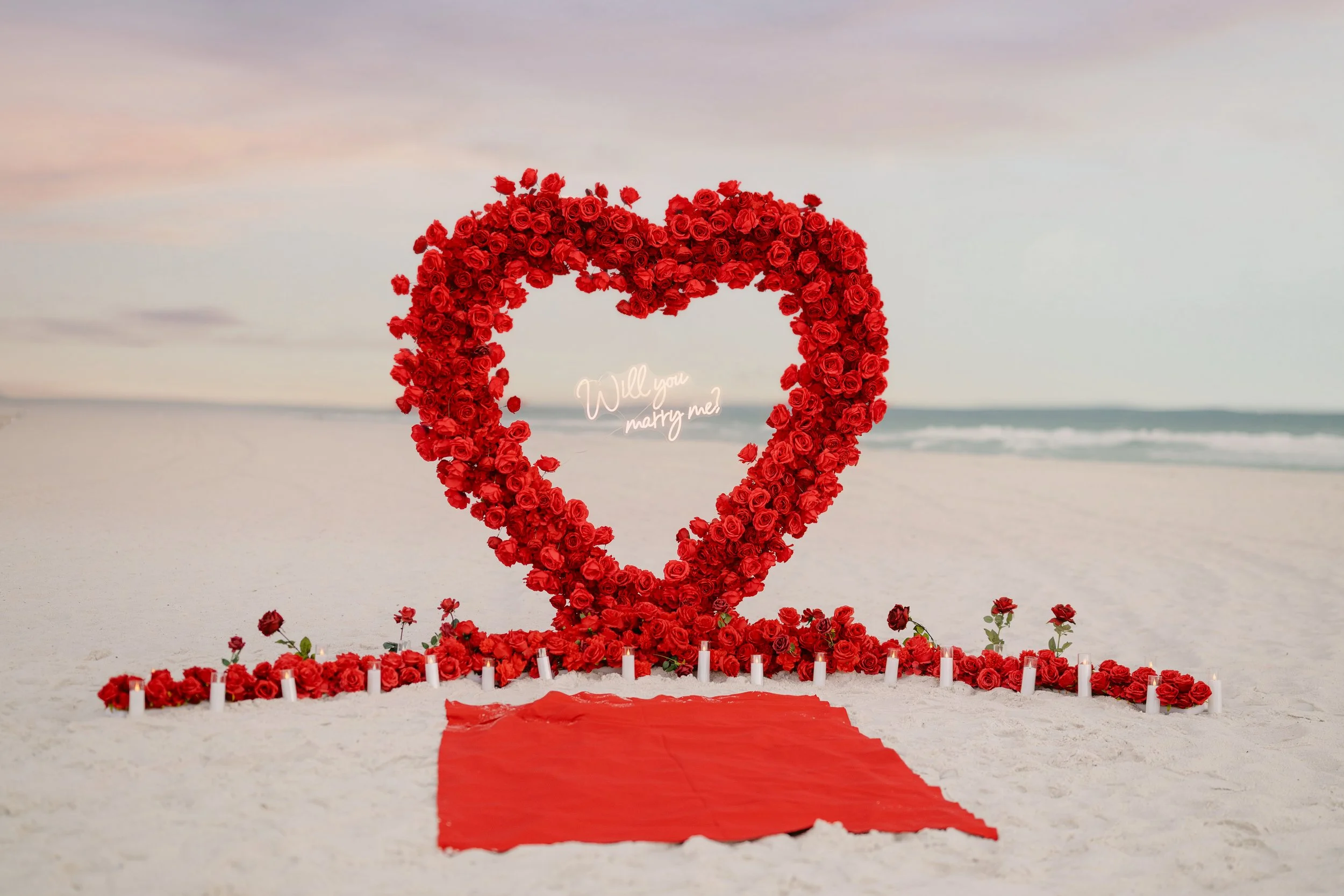 Our Medium Proposal Setup elevates the moment with an unforgettable romantic statement. Featuring a full ground meadow, a “Marry Me” sign, and an 8-foot heart of roses styled on the ground, this design creates a bold yet intimate backdrop for your proposal. The rose heart adds a dramatic, love-filled touch while still feeling elegant and intentional. This setup is ideal for couples who want a show-stopping look without going fully over the top — perfect for sunset beach proposals and once-in-a-lifetime moments.
